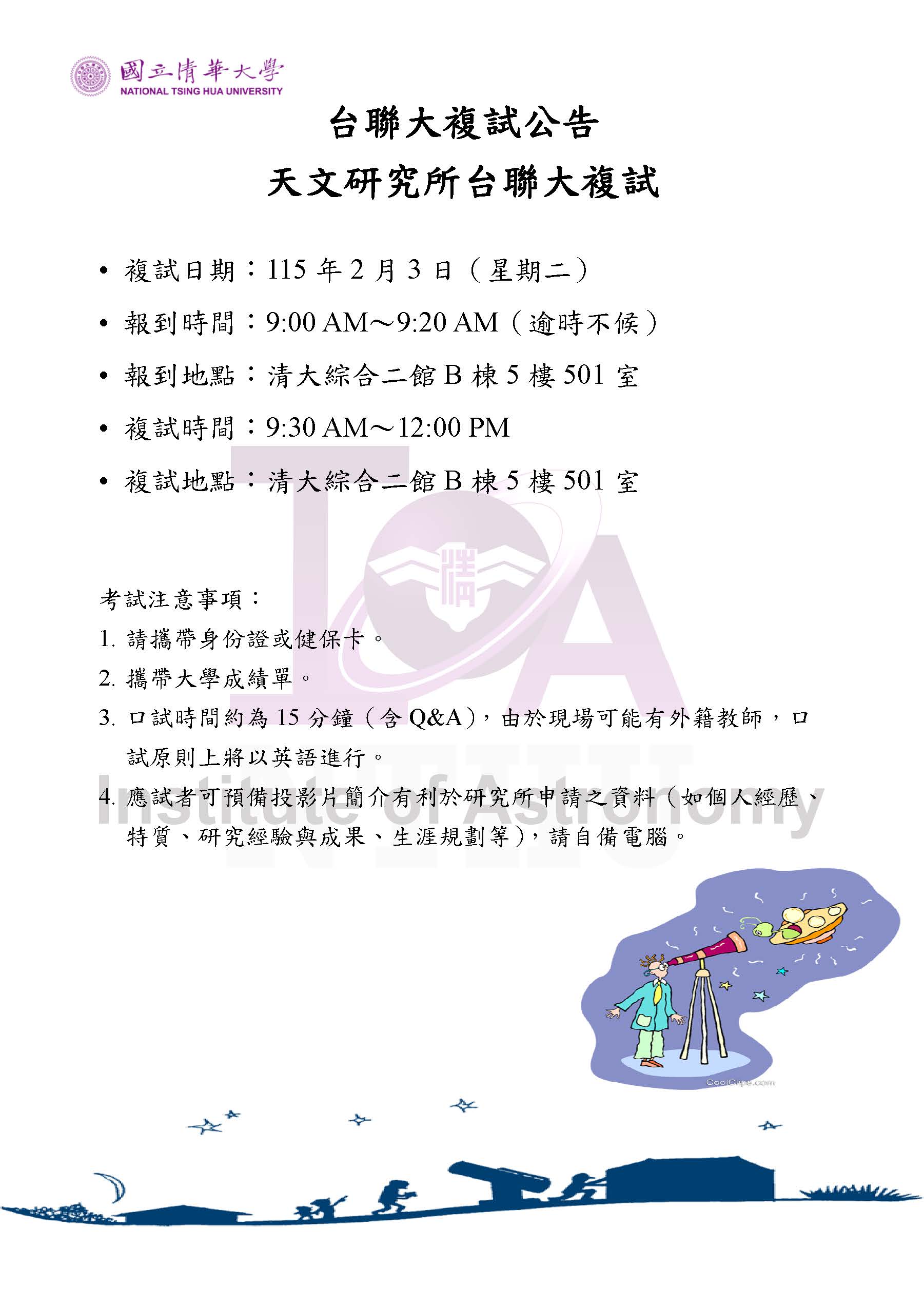 115學年度天文研究所台聯大複試公告